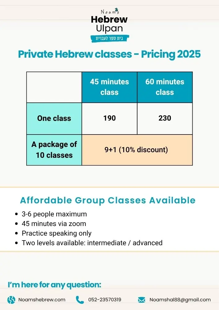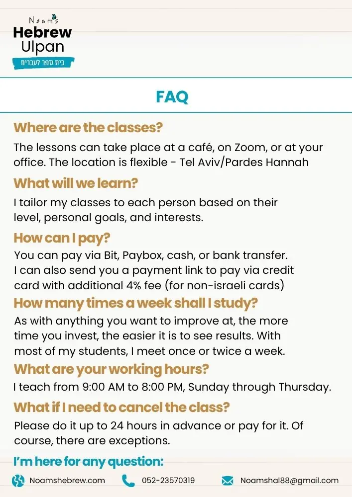 Personalized lesson plan tailored to your goals and level ✓ Interactive conversation practice – speak Hebrew from day one ✓ Grammar explanations made simple and practical ✓ Cultural context – understand Israel through the language ✓ Homework assignments with detailed feedback ✓ Learning materials – worksheets, exercises, and resources ✓ WhatsApp support for quick questions between sessions